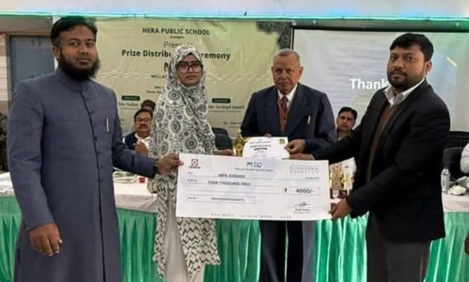 हेरा पब्लिक स्कूल, आज़मगढ़ द्वारा IIT-JEE एवं NEET की तैयारी हेतु आयोजित प्रतिष्ठित Millat Talent Quest (MTQ) स्कॉलरशिप परीक्षा में आरफा सिद्दीकी ने शानदार प्रदर्शन किया है। उन्होंने कड़ी प्रतिस्पर्धा के बीच मंडल स्तर (Divisional Level) पर दूसरा स्थान प्राप्त कर उल्लेखनीय सफलता हासिल की है।