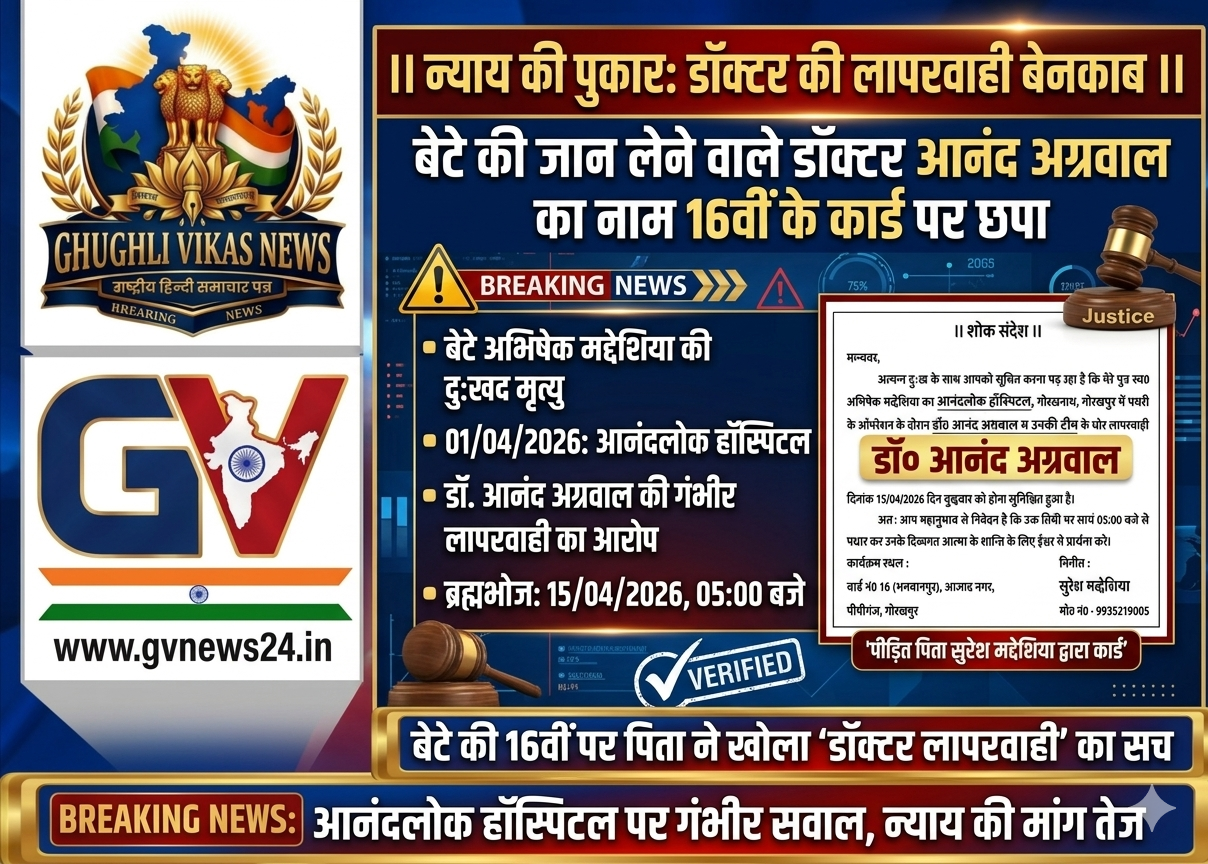 “दिनांक 1 अप्रैल 2026 को आनंदलोक हॉस्पिटल (गोरखपुर) में डॉ. आनंद अग्रवाल और उनकी टीम की घोर लापरवाही के कारण पथरी के ऑपरेशन के दौरान हमारे सुपुत्र अभिषेक मद्धेशिया का दुःखद निधन हो गया।”